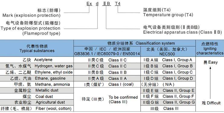 ExdIIBT4適用于II類B級(代表性物質:乙烯),溫度組別為T4及以下組的爆炸性氣體或粉末混合物存在的環境。